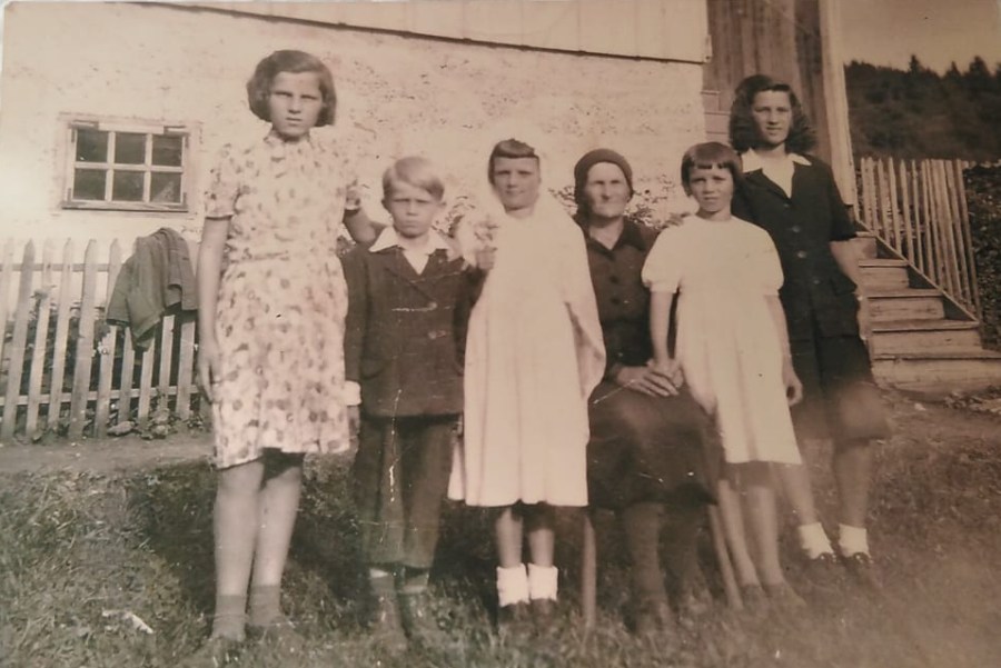Slikano ’46. u Prhcima. Baka je druga s desne strane, u bijeloj haljinici. Njena mama je drži za ruku.